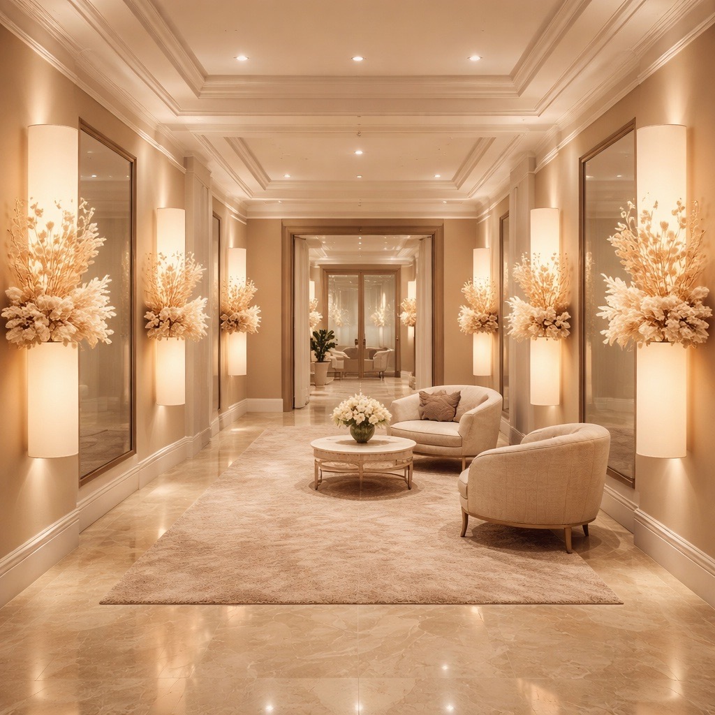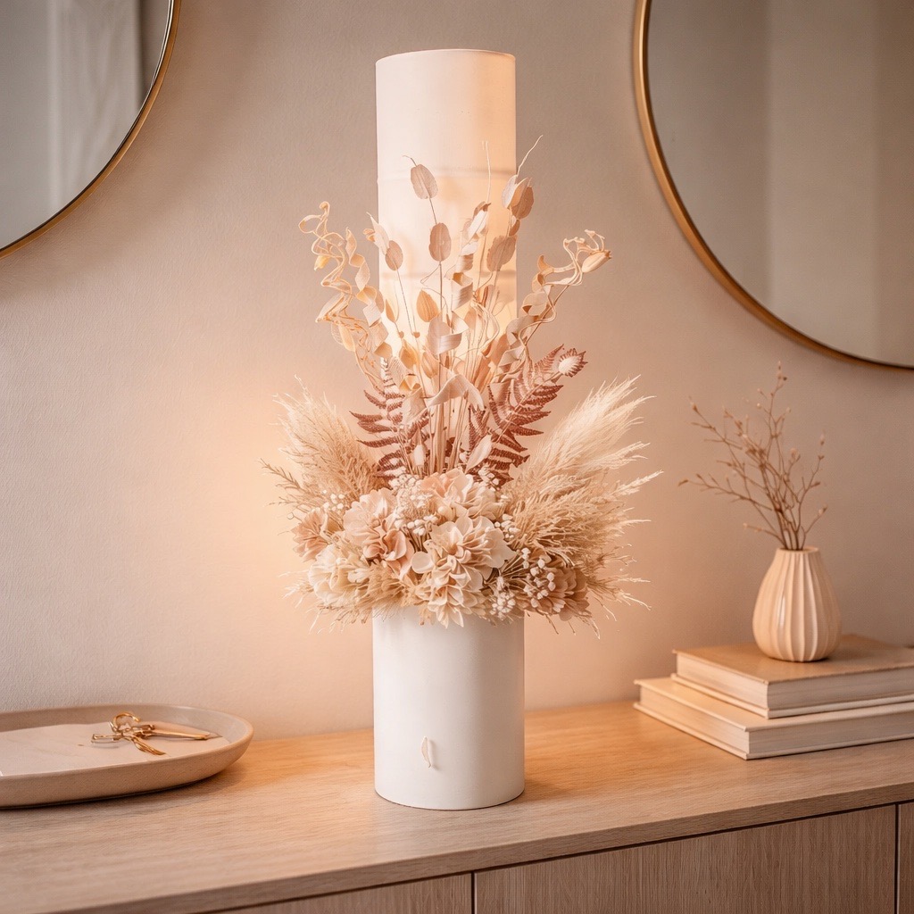 Fantaisie Florale pour un hôtel Applique© en soie ivoire avec un bouquet de fleurs séchées et de plantes végétalisées. Style: Art Déco / Belle Époque Date: 22/09/2022 Collection: Nature