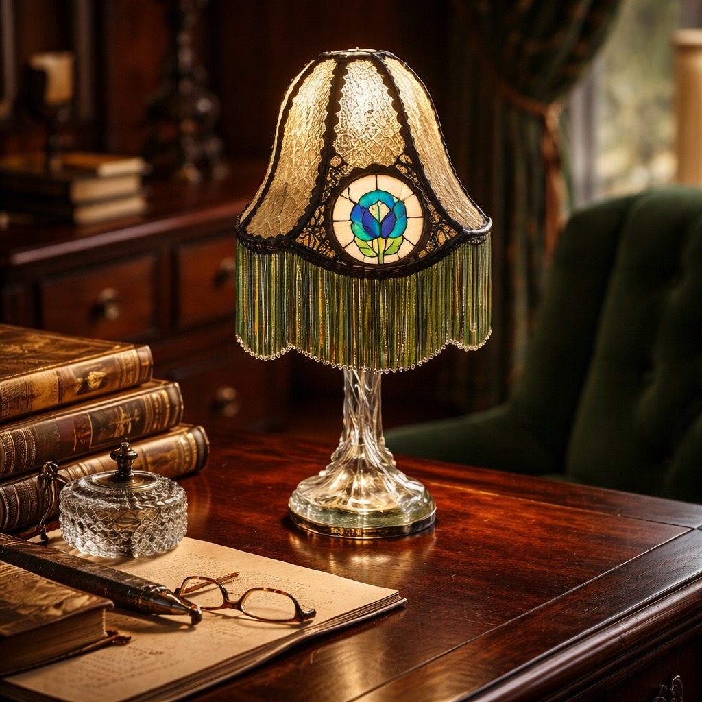 Modèle exclusif© Alliance subtile entre l’éclat du vitrail et la douceur tamisée d’étoffes précieuses. Finitions avec frange et sequins. Cette pièce unique a été réalisée à la demande d’un collectionneur américain. Cette lampe allie le style victorien et apporte une touche de Tiffany originale et inédite.